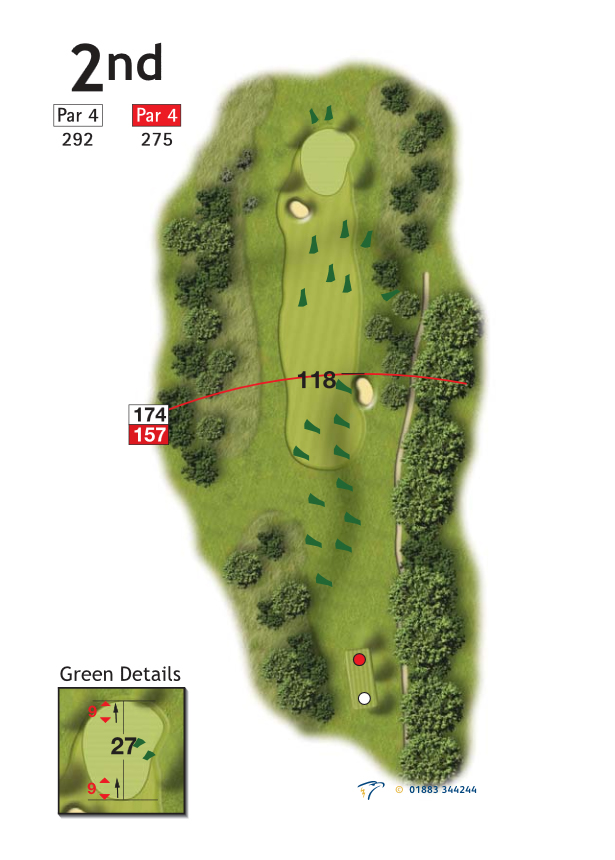 A short par 4 with a fairway which appears narrow due the to the hedges and trees left and right, the fairway slopes to the right, but the run will favour the approach shot to the green, which has a solitary bunker defending the left front corner.