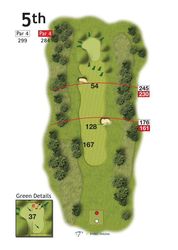 A straight par 4, over the brow of the rise in the ground, to a wide fairway with single bunkers on the right and left providing the only hazards for the drive. The green is surrounded by mounds that should feed approach shots into the playing surface. An uphill putt from the front of the green is a definite advantage on this hole.