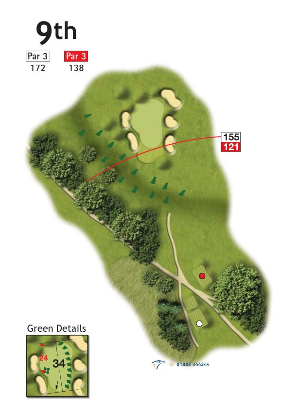 The finishing hole, and one worthy of the status, is a short hole from an elevated tee to a green virtually surrounded by five large bunkers, and only a very narrow entrance. With the clubhouse and the thatched cottage as a backdrop, the tee shot is all important, often playing much longer than the yardage would suggest. With such a large green even being on the putting surface does not ensure that a three will appear on the scorecard.