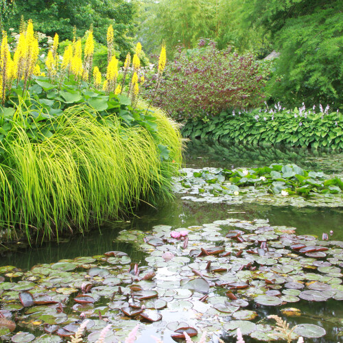 Come July, the Waterlilies begin their show, accompanied ashore by many varieties of bright Lobelia and feathery Astilbe, to form a symphony of whimsical summer colour.